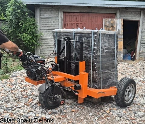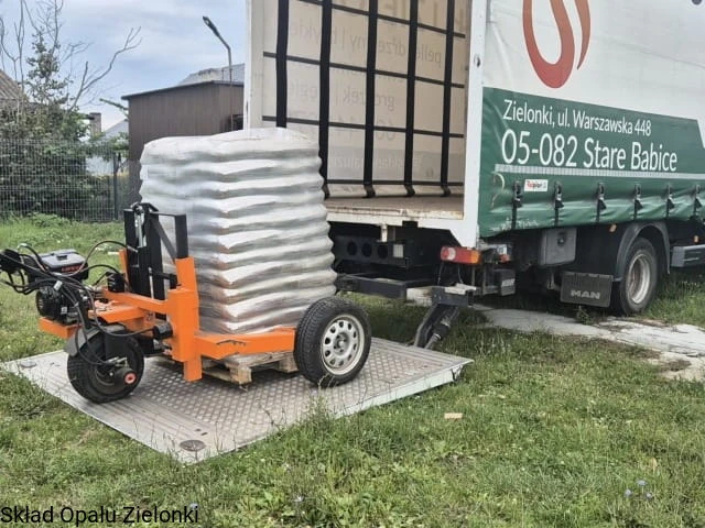 Rozładunek wózkiem paletowym terenowym, co daje możliwość przejechania nawet po trawniku i postawienia palety w dogodnym miejscu dla Państwa.