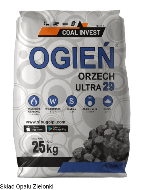 Węgiel Orzech OGIEŃ ULTRA Sibugol wysoka kaloryczność i niska zawartość popiołu, zapewnia dużą wydajność i niskie zużycie węgla.